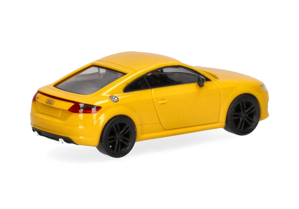 Model osobního automobilu Audi TT Coupé ve žluté barvě s černými koly.