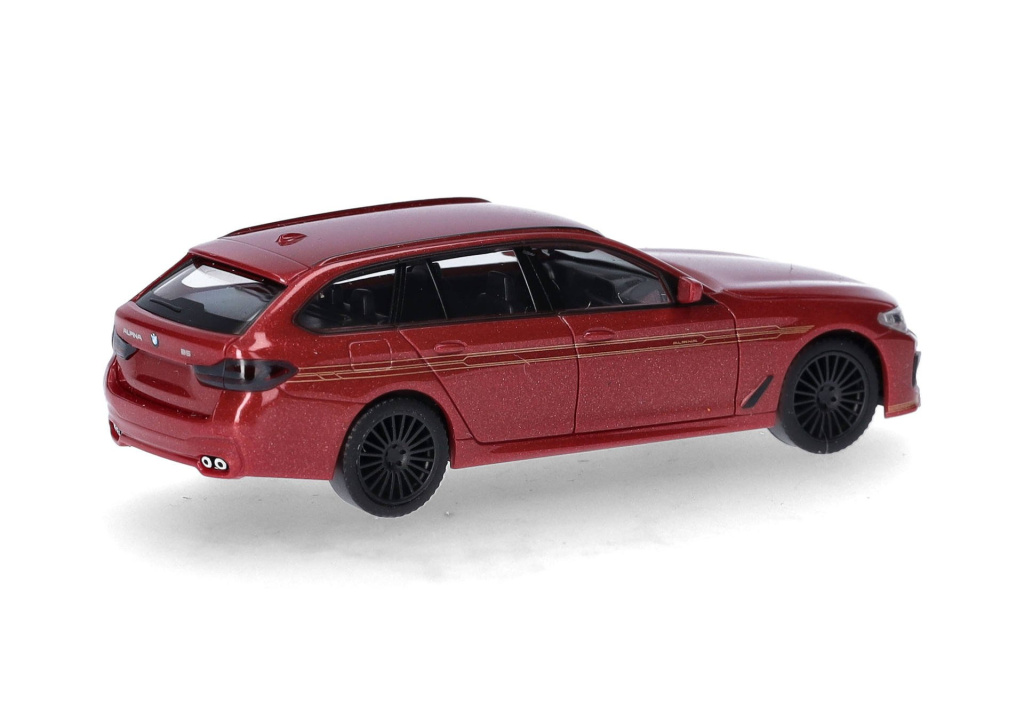Model osobního automobilu BMW Alpina B5 Touring v červené metalické barvě.