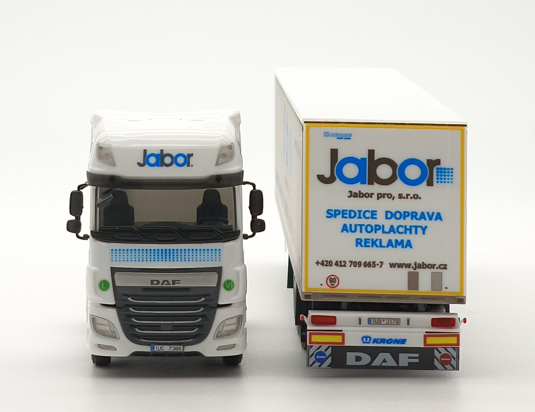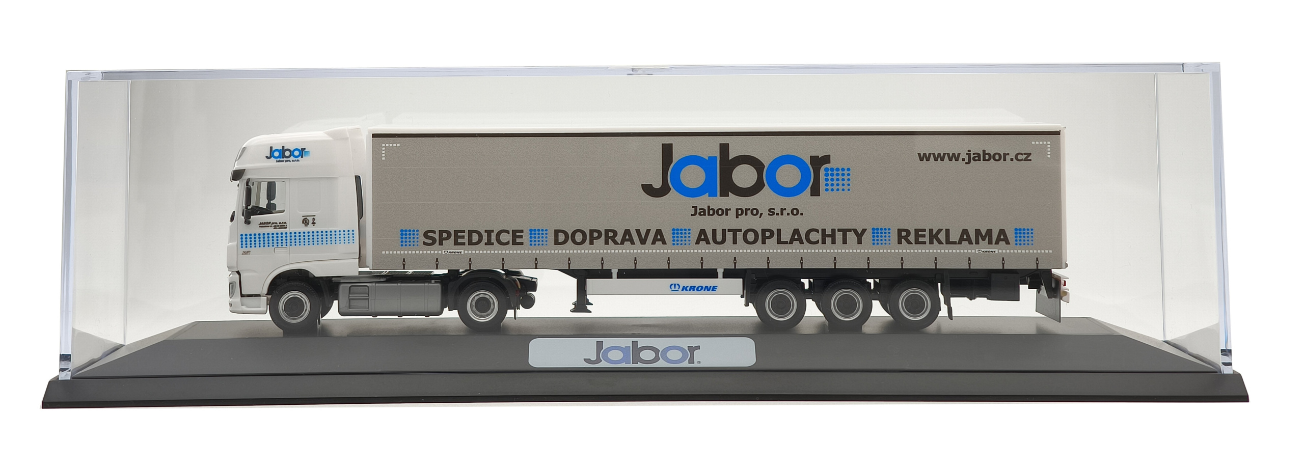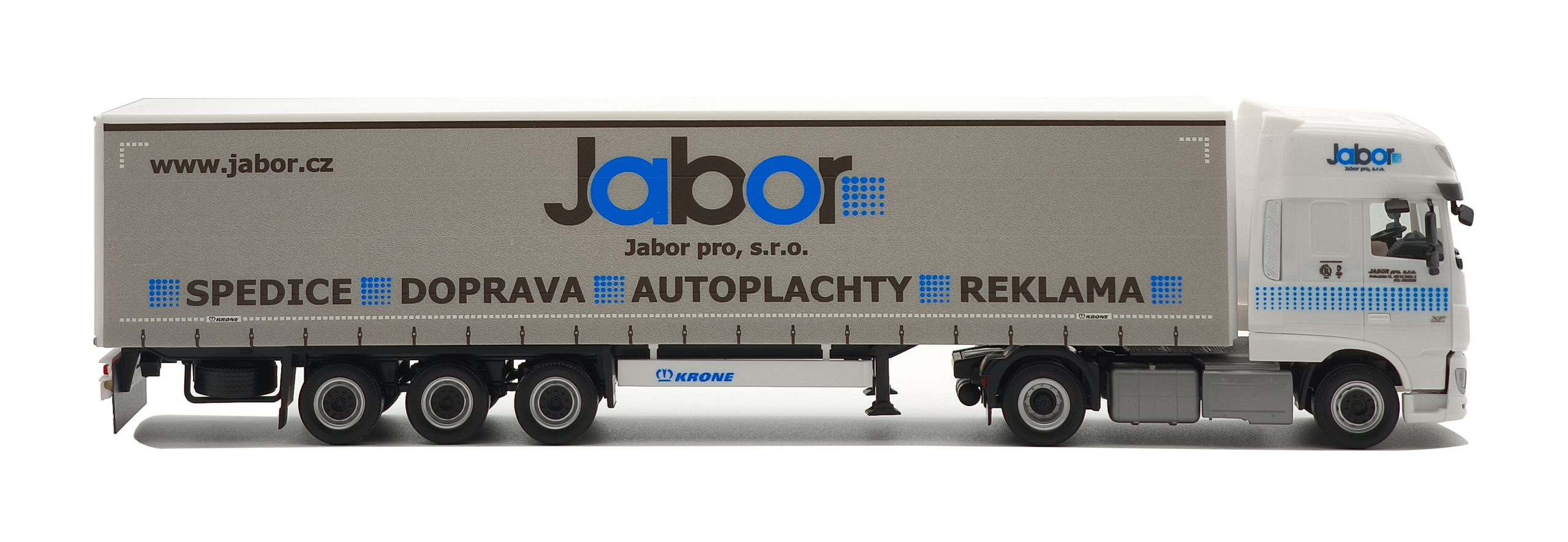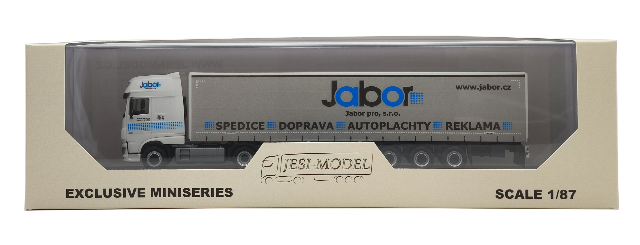 Model of the two-axle Daf XF 106 SSC tractor unit with a three-axle curtain-side semi-trailer from Jabor company in 1:87 scale. The set is based on a real vehicle from Jabor pro, s.r.o. .