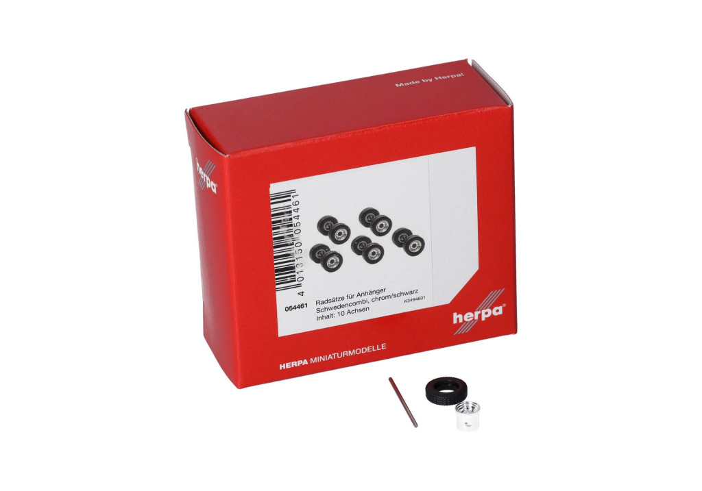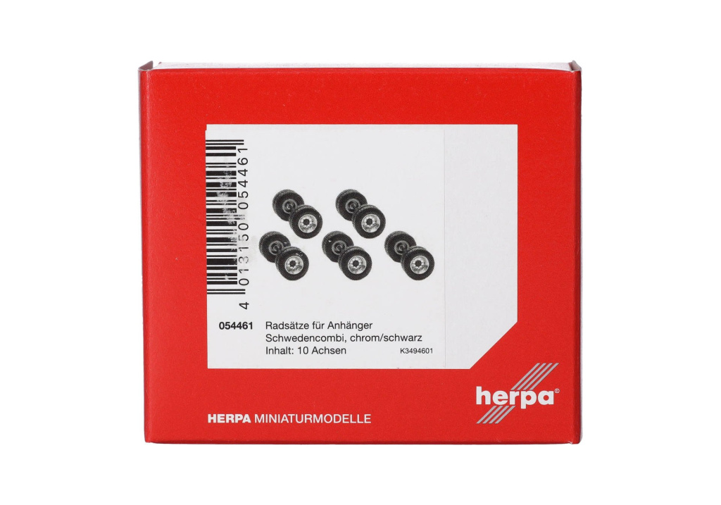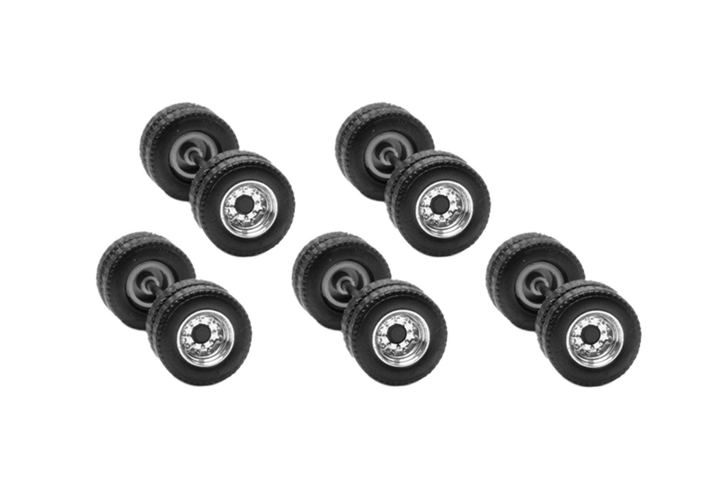 Sada dvoudílných disků s pneumatikami pro návěsy švédských souprav. Jednodílné sady kol lze nyní vyměňovat. Sada obsahuje díly pro 10 náprav kol s chromovanými ráfky a černými náboji.