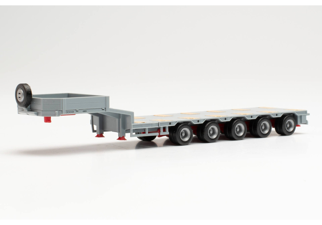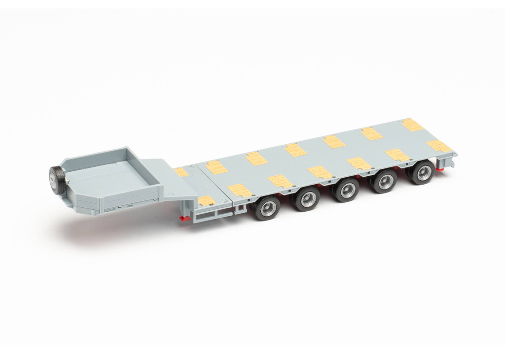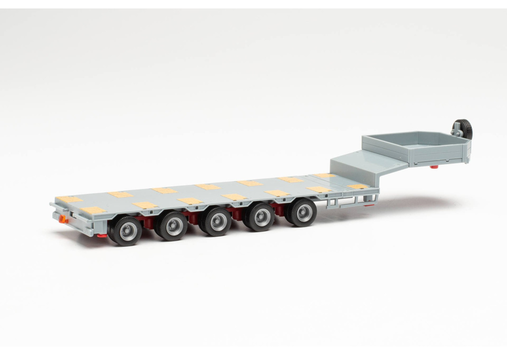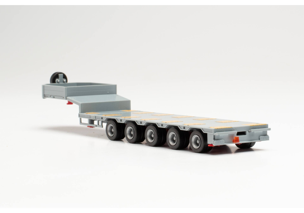 Těžký pětinápravový návěs Goldfhofer v šedé barvě,teleskopický se zadními sklápěcími nájezdy a jedním zadním oranžovým majákem.Rovná ložná ploch ma v základním provedení déku cca 97mm,tuto délku lze na středním posuvném nosníku prodloužit až na cca 227mm s jedním příčným nosníkem uprostřed. Nájezdy v šedé barvě a stříbrné klanice nejsou na obrázku,ale jsou součástí-v balení.