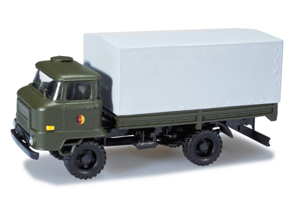 Model dvounápravového nákladního automobilu IFA L 60 z produkce bývalé NDR,se zaplachtovanou korbou,tak jak bylo toto vozidlo používáno v armádě NDR.