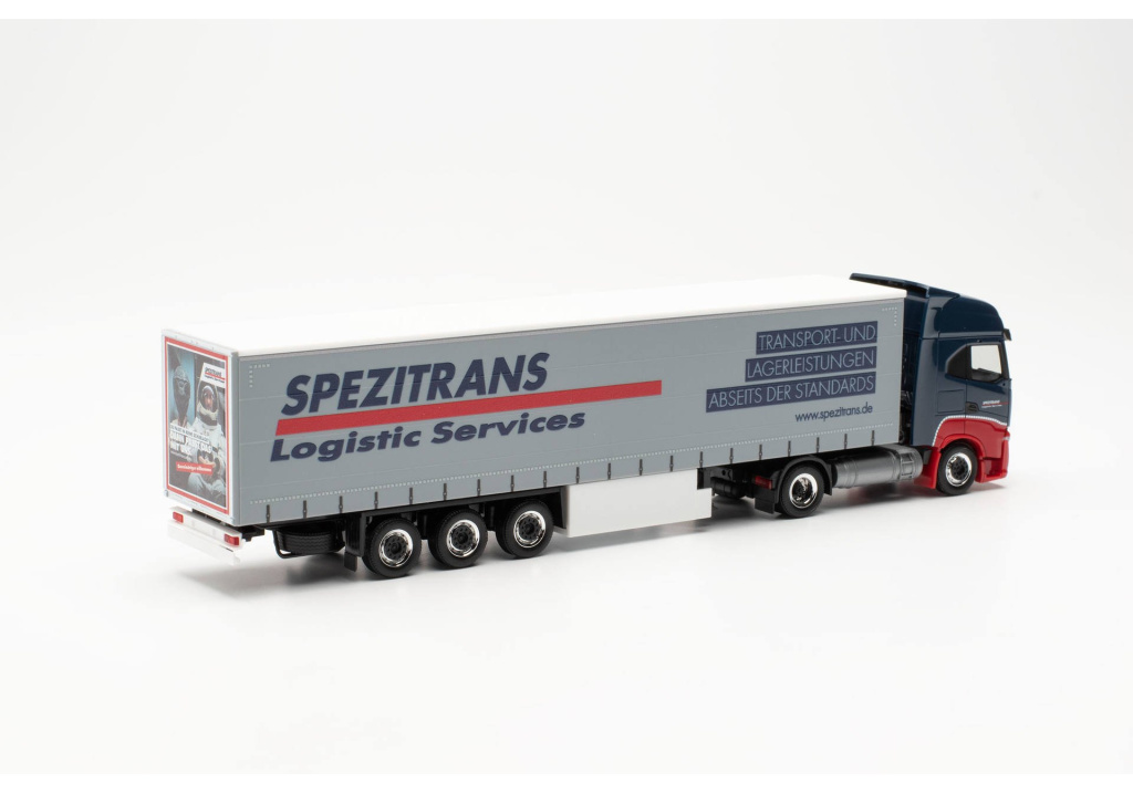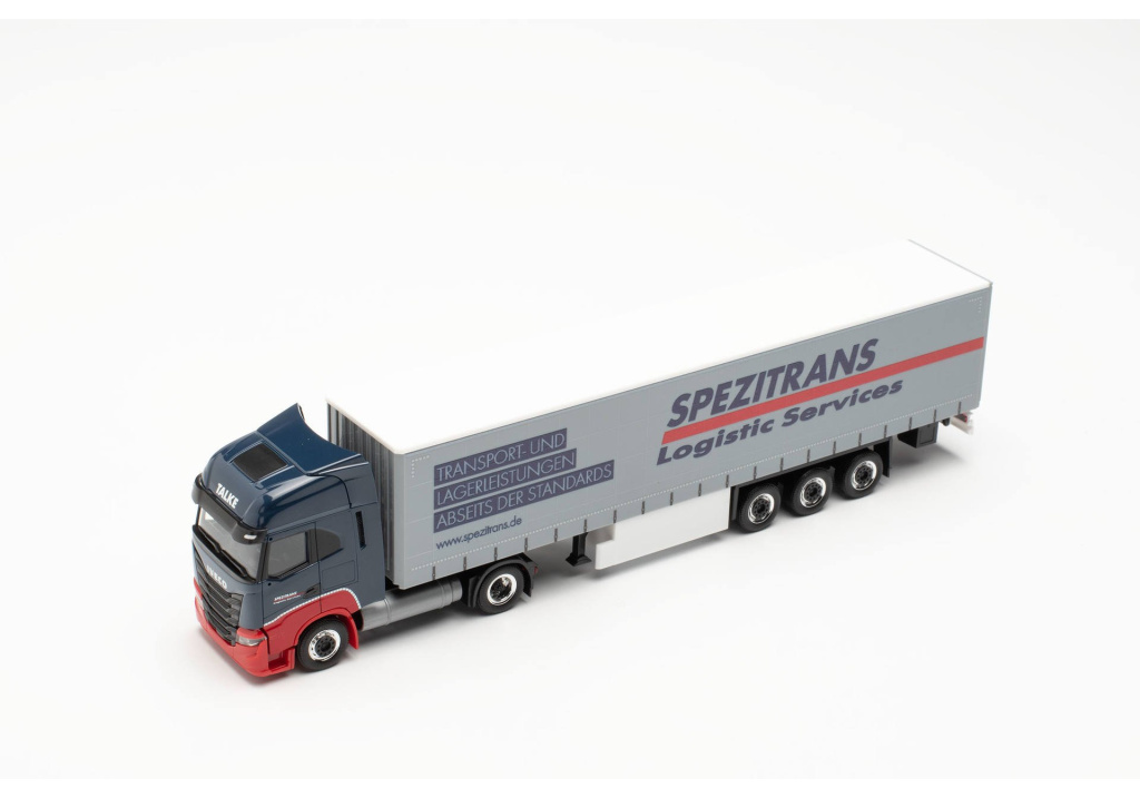 Model dvounápravového tahače Iveco S-Way LNG s třínápravovým návěsem se shrnovací plachtou spediční společnosti Spezitrans z Grimmenu, který patřící do skupiny Talke Group.