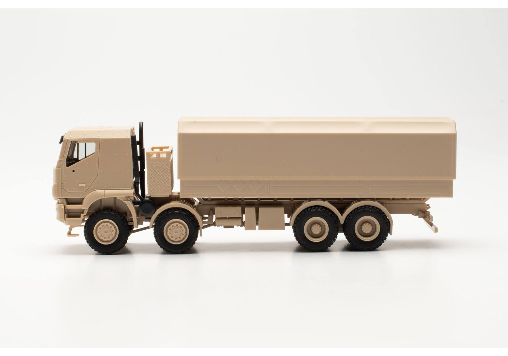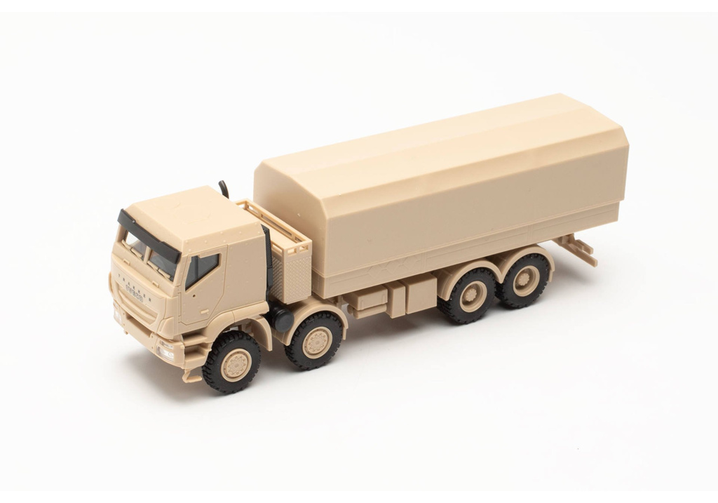 Model čtyřnápravového nákladního automobilu Iveco Trakker s pohonem 8x8 s pancéřovanou kabinou a zaplachtovanou korbou,v pískové barvě bez kamufláže a potisků.