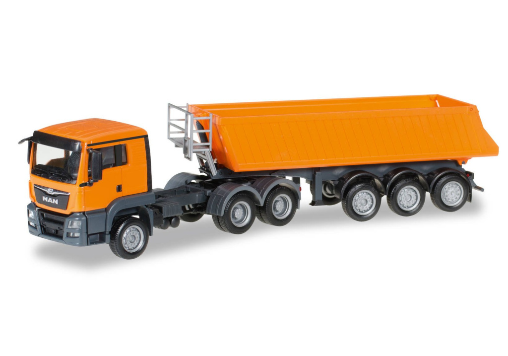 Model třínápravového tahače MAN TGS L s třínápravovým sklápěcím návěsem v neutrální oranžové barvě bez popisů.