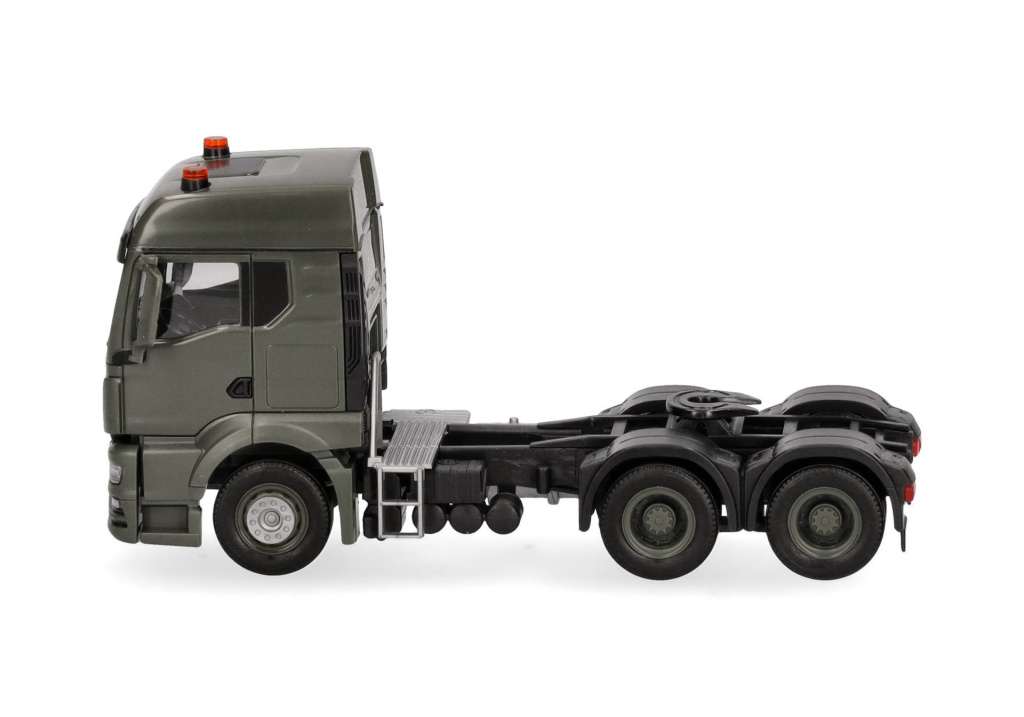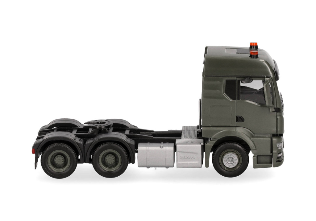 Model třínápravového tahače MAN TGS TM s pohonem 6x4 v zeleném vojenském zbarvení bez kamufláže a popisů, kabina je doplněna oranžovými majáky.