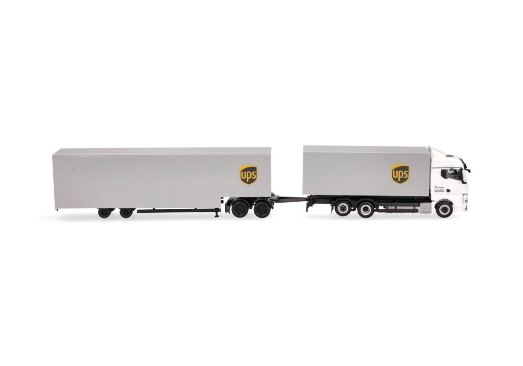 Model třínápravového nákladního automobilu MAN TGX GX s výměnnou skříňovou nástavbou a čtyřnápravovým vlekem v provedení přepravní společnosti UPS.