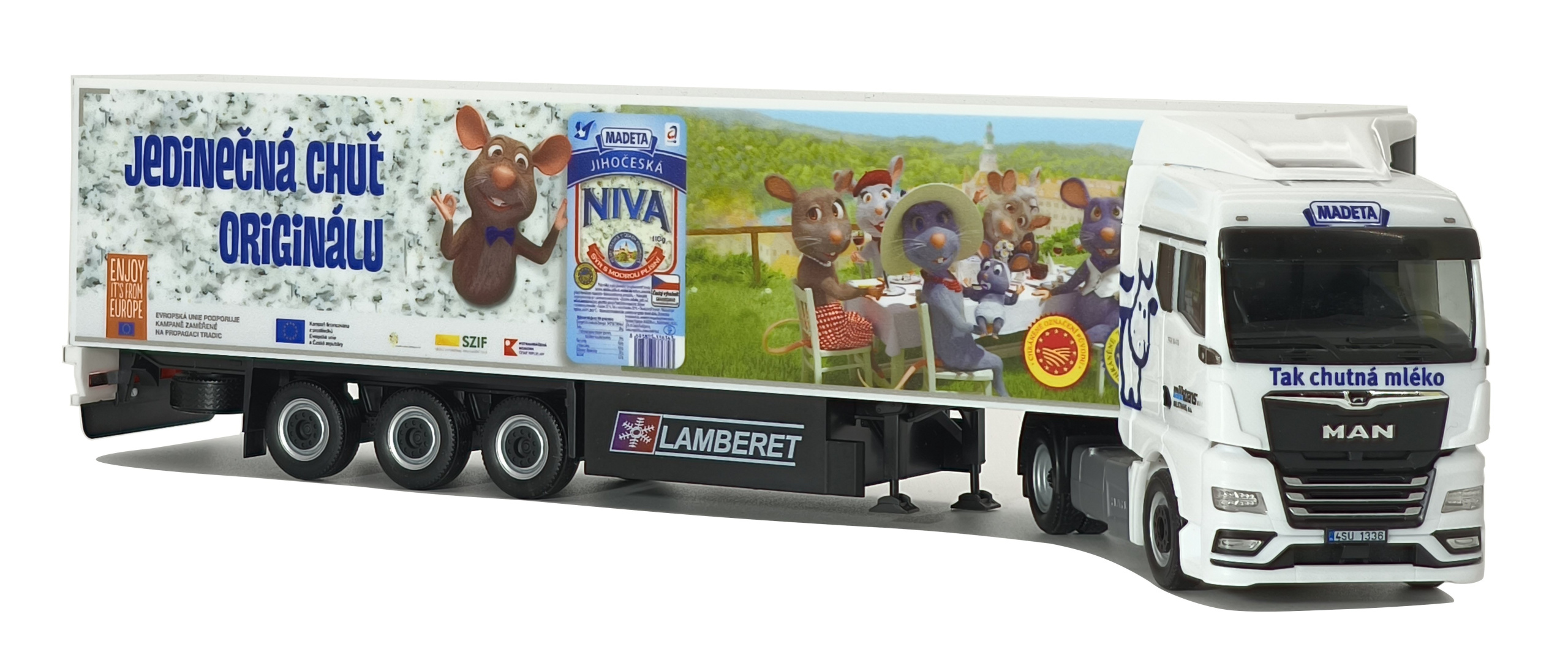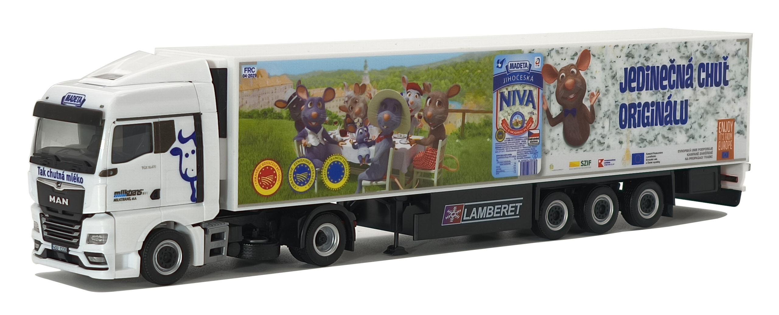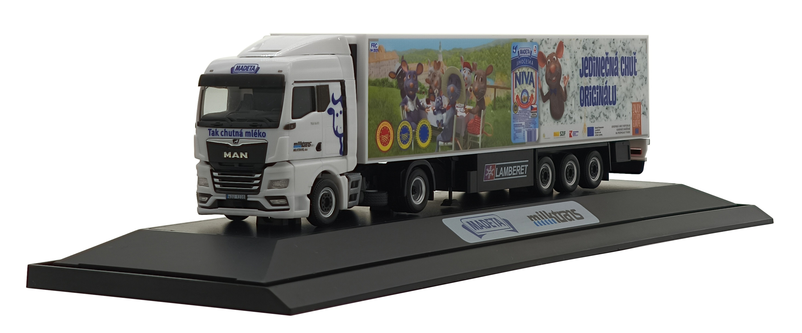 Model dvounápravového tahače MAN TGX s třínápravovým chladírenským návěsem Milktrans / MADETA v měřítku 1:87. Souprava vychází ze skutečného vozidla, které zajišťuje přepravu mléčných výrobků MADETA v České republice.