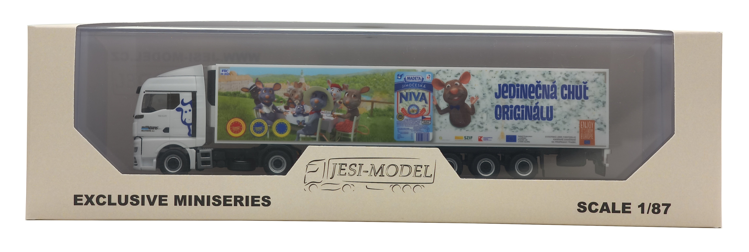 Model of a two-axle MAN TGX truck tractor with a three-axle refrigerated trailer Milktrans / MADETA in 1:87 scale. The model is based on a real vehicle that transports MADETA dairy products across the Czech Republic.