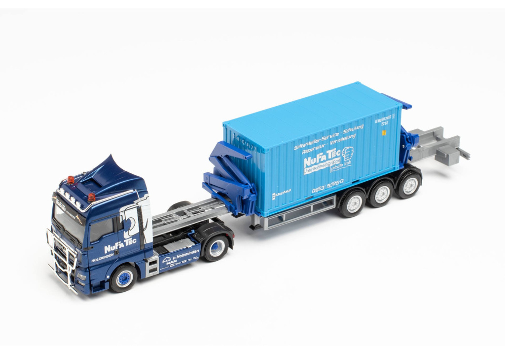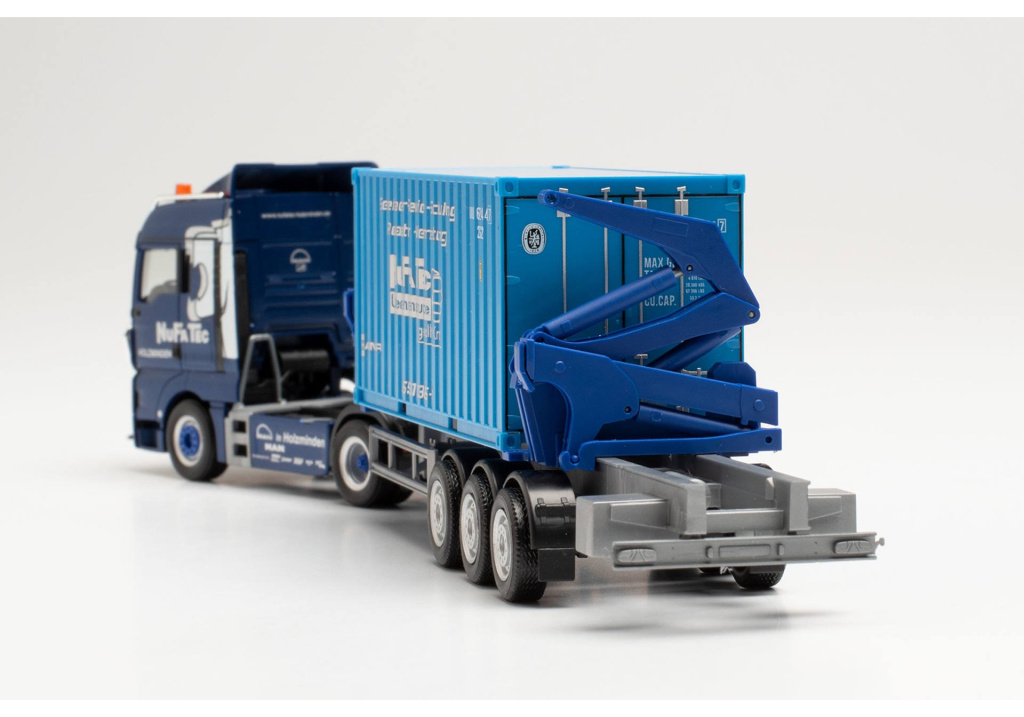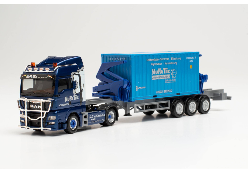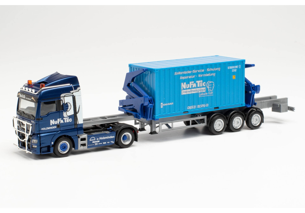Model dvounápravového tahače MAN TGX XLX s třínápravovým návěsem na přepravu kontejnerů s bočním nakladačem Hammar od společnosti NuFaTec v Holzmindenu.