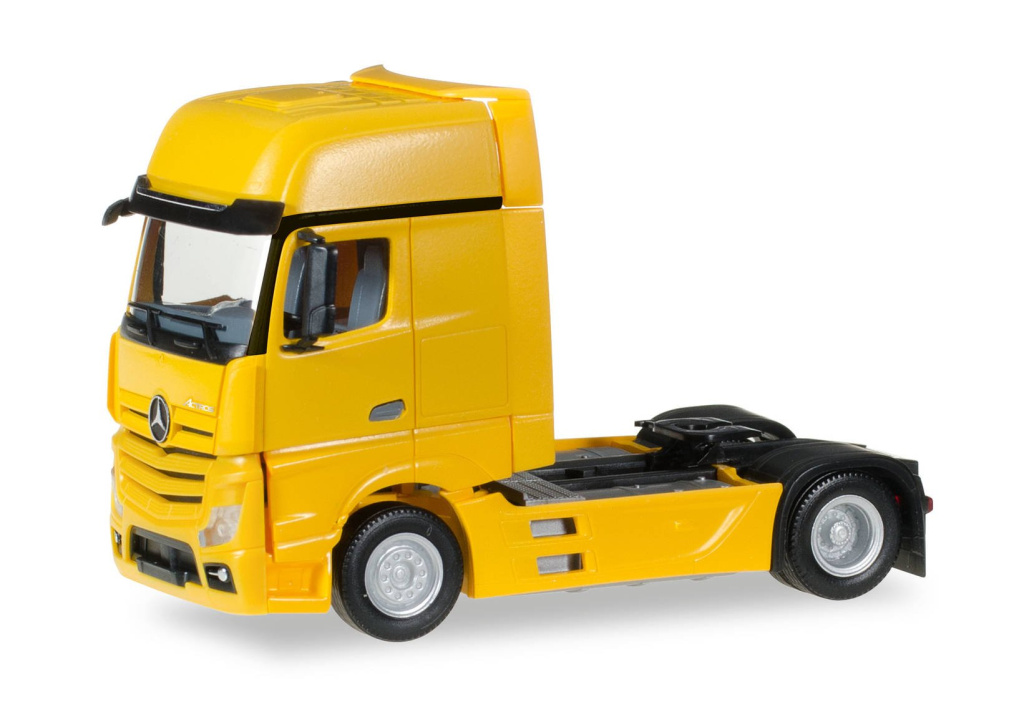 Model dvounápravového solo tahače Mercedes Benz Actros 2011 s kabinou v provedení  Gigaspace ve žluté barvě.