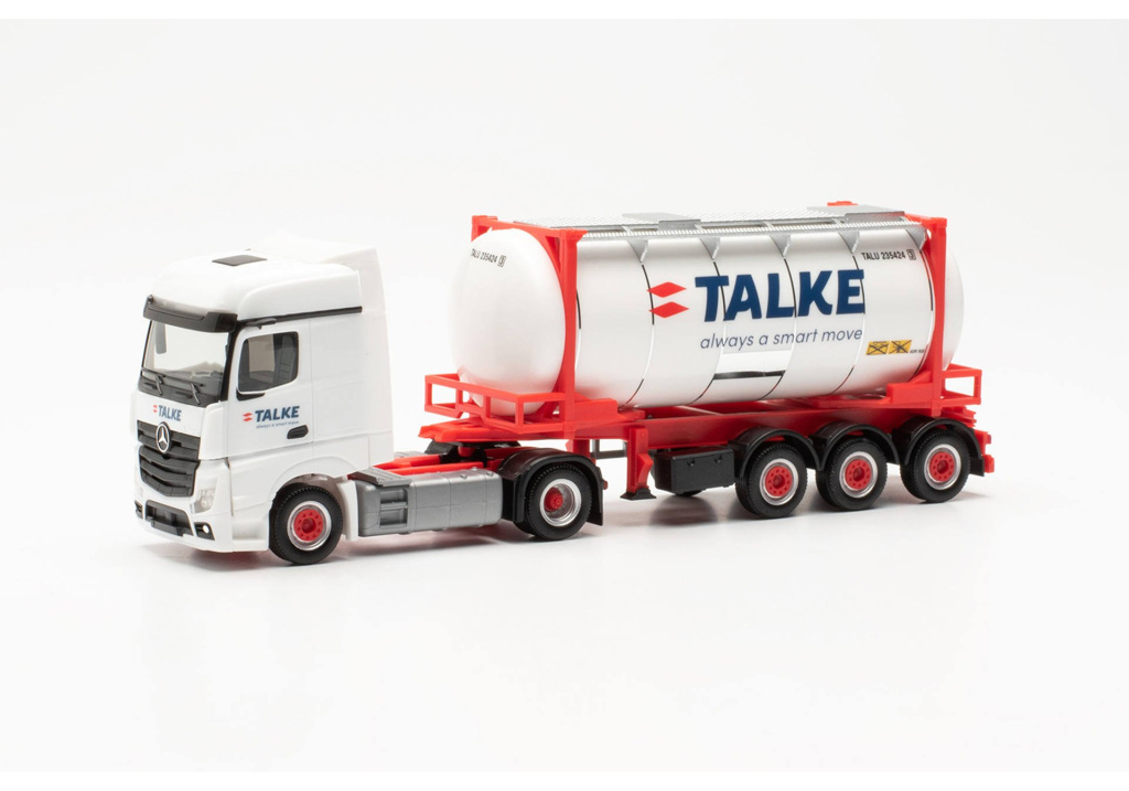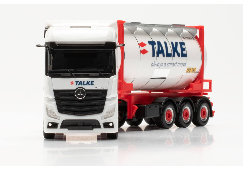 Model dvounápravového tahače Mercedes-Benz Actros Bigspace s třínápravovým návěsem na přepravu kontejnerů s naloženým cisternovým kontejnerem.Celá souprava je v provedení dopravní společnosti Talke.