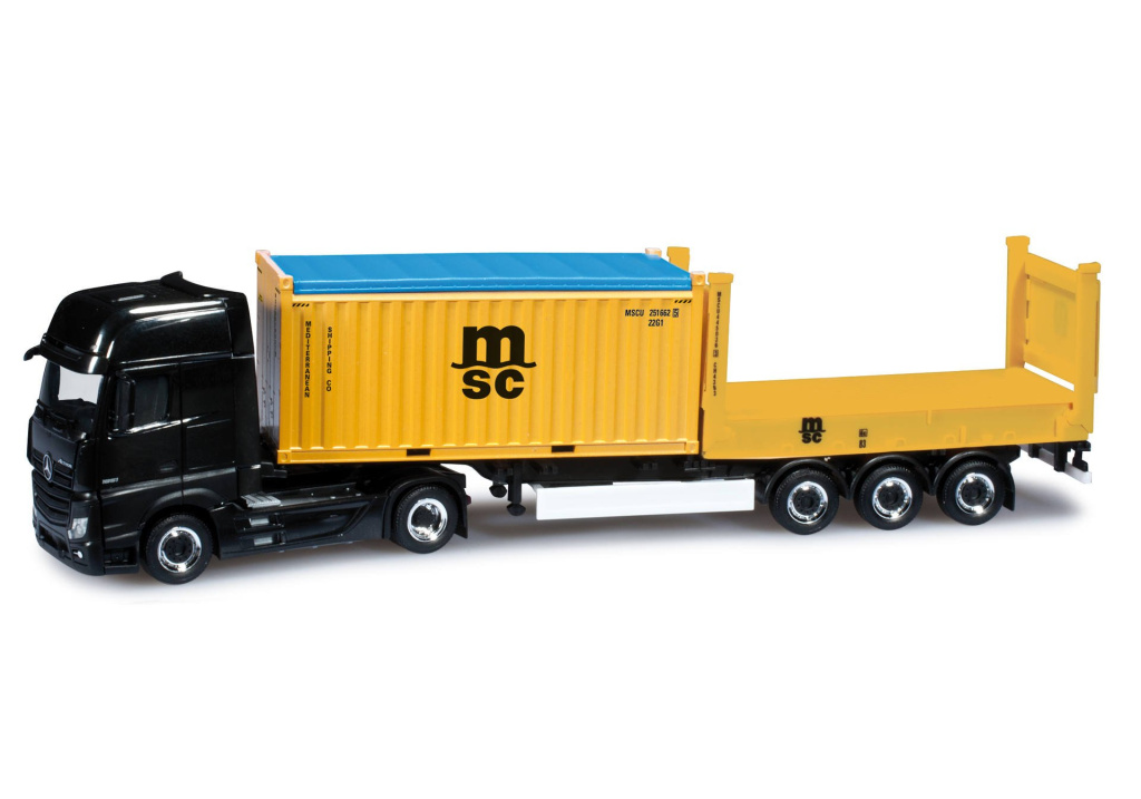 Model dvounápravového tahače Mercedes-Benz Actros Gigaspace přepravní společnosti MSC s třínápravovým návěsem který je naložen 20ti stopým skříňovým kontejnerem a novým 20ti stopým plochým kontejnerem.