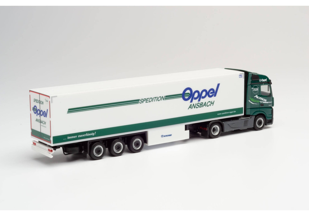Model dvounápravového tahače Mercedes-Benz Actros s třínápravovým chladírenským návěsem dopravní společnosti Oppel z německého Ansbachu.