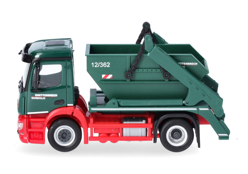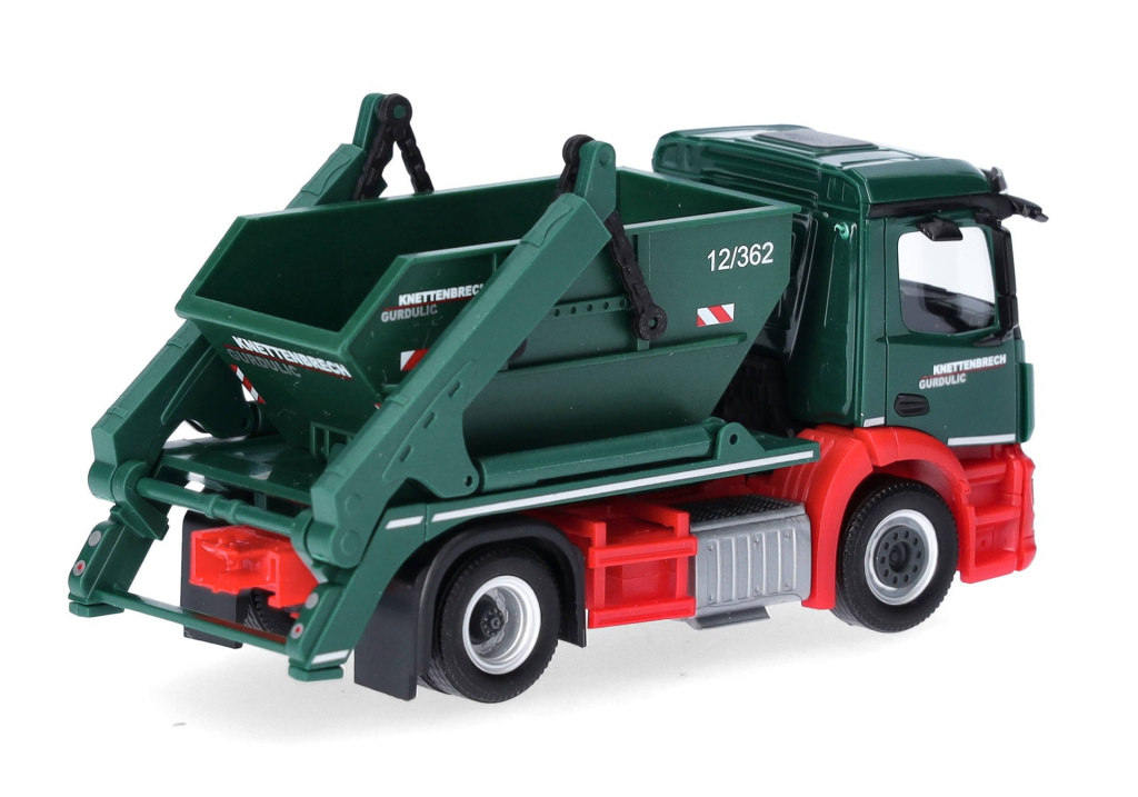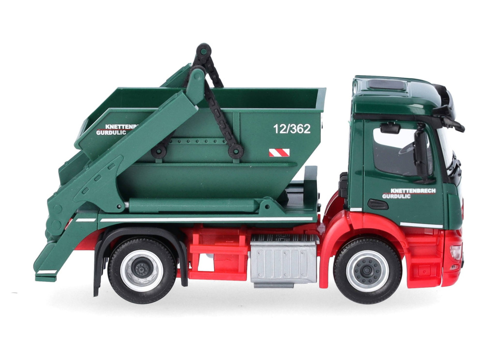 Model dvounápravového nákladního automobilu Mercedes-Benz Actros S s nástavbou nakladače kontejnerů AK12 v barvách společnosti Knettenbrech & Gurdulic,která se zabývá likvidací odpadů.