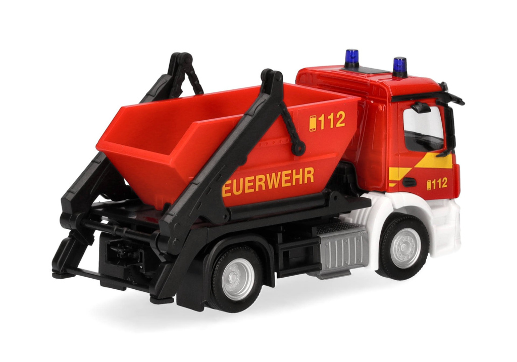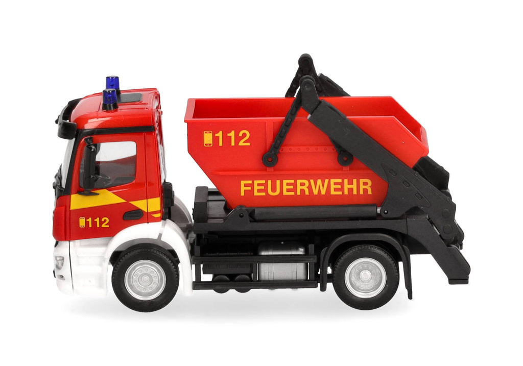 Model dvounápravového nákladního automobilu Mercedes-Benz Actros S jako nosič a nakladač kontejnerů  AK12 v hasičském provedení .