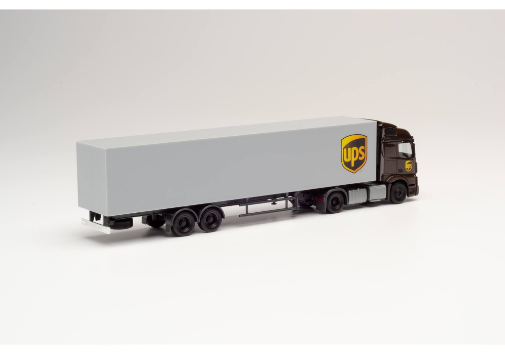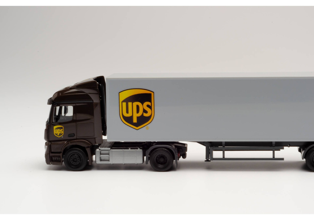 Model dvounápravového tahače Mercedes-Benz Actros Streamspace 2.3  s dvounápravovým skříňovým návěsem v provedení logistické společnosti UPS.