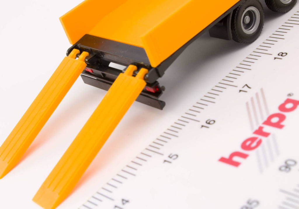 Model třínápravového nákladního automobilu Mercedes-Benz Arocs M s nízkým výměnným kontejnerem a s dvounápravovým nízkým podvalníkem se sklápěcími nájezdy v oranžové neutrální barvě.
