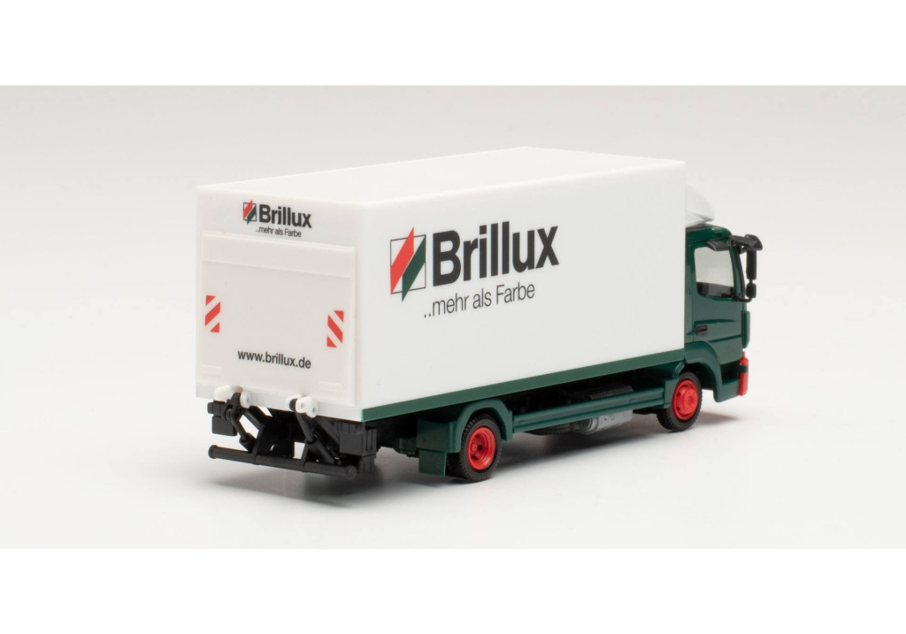Model dvounápravového nákladního automobilu Mercedes-Benz Atego ‘13 se skříňovou nástavbou a zadním hydraulickým sklápěcím čelem.Společnost Brillux se sídlem v Münsteru používá pro větší dodávky barev právě takové vozidlo.