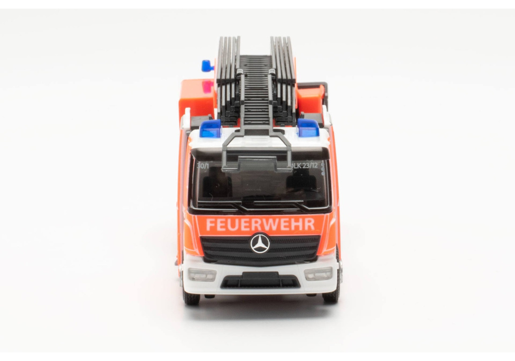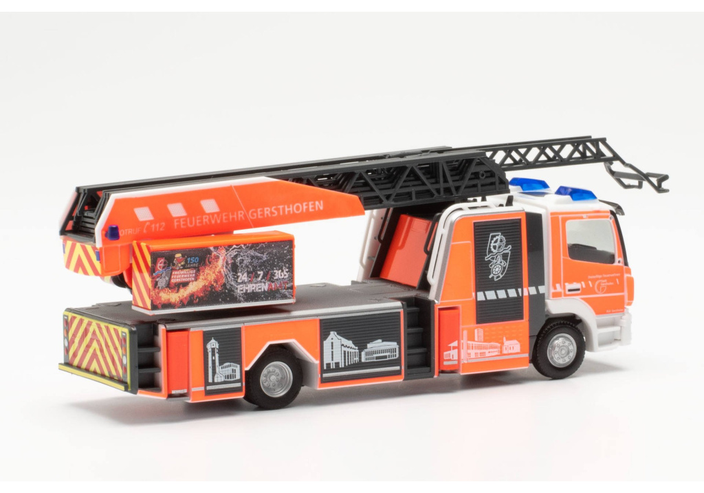 Model dvounápravového nákladního automobilu Mercedes-Benz Atego s nástavbou hasičského žebříku Rosenbauer v barevném provedení hasičského záchranného sboru v Gersthofenu ve Švábsku.
