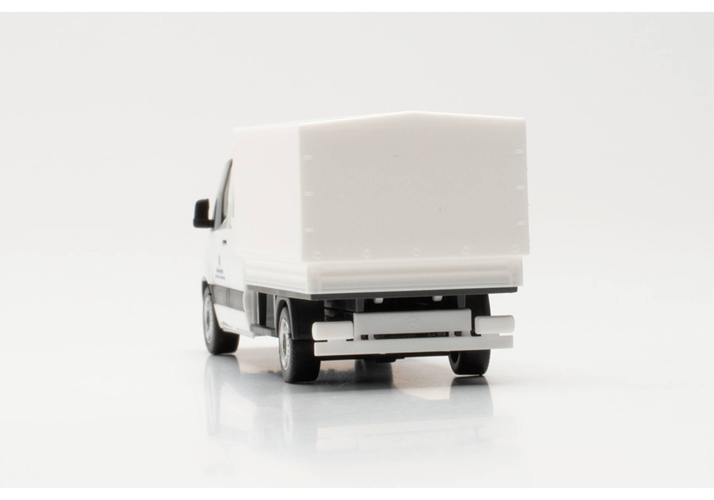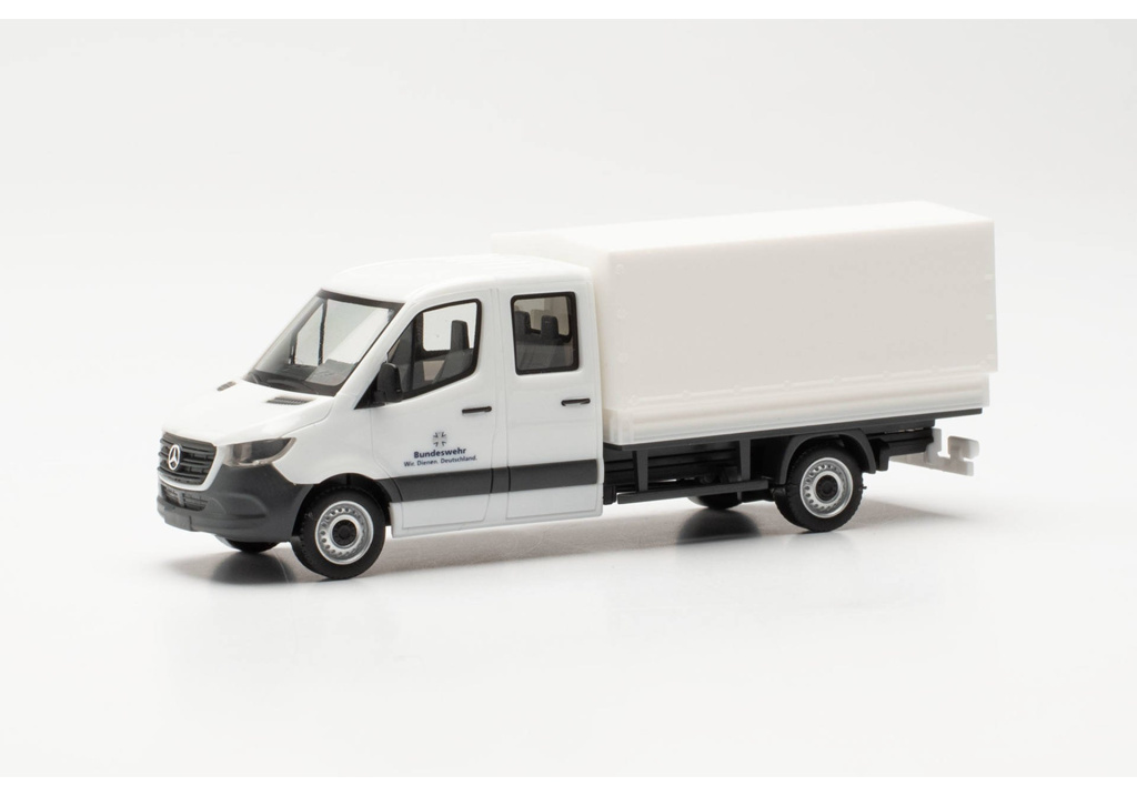 Model dodávky Mercedes-Benz Sprinter `18 s dvojitou kabinou,se zaplachtovanou korbou v bílé barvě,jako servisní vozidlo Bundeswehru.