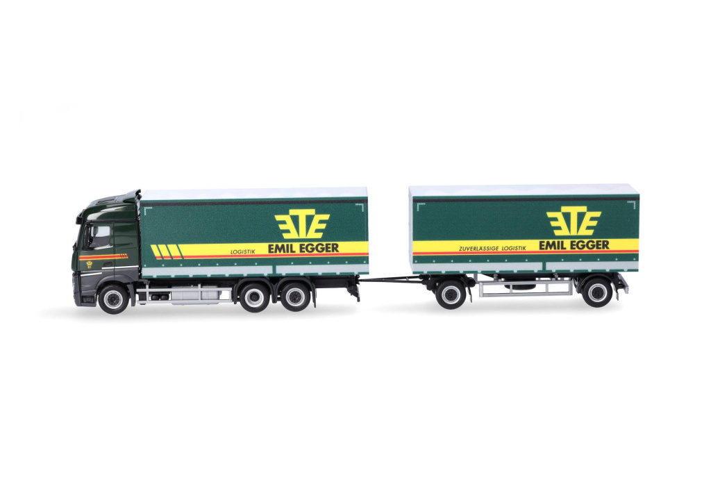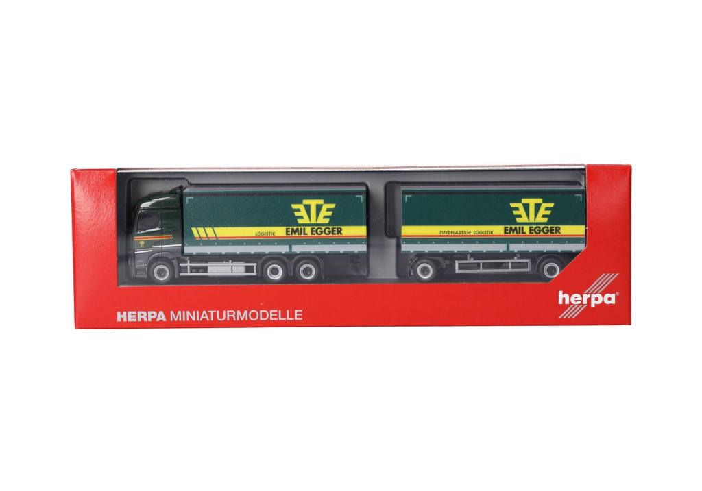 Model třínápravového nákladního automobilu Mercedes-Benz Streamspace 2.5 s dvounápravovým vlekem v barvách švýcarského rodinného podniku Emil Egger,který funguje již více než 90 let.Ve Švýcarsku je v současnosti 11 poboček s přibližně 800 zaměstnanci.