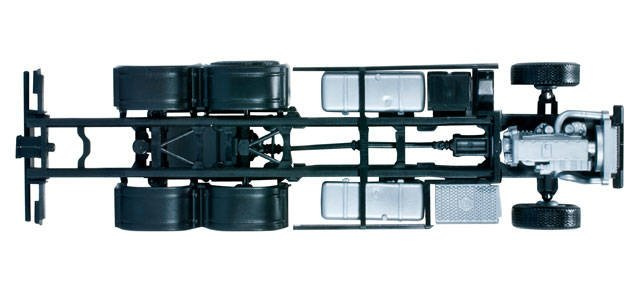 Stavebnice podvozku pro třínápravový nákladní automobil Mercedes Benz Actros 2011 pro nástavbu v délce 7,45m. Podvozek je v černé barvě se stříbrnými doplňky.