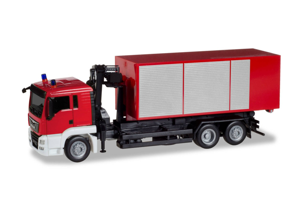 Stavebnice modelu třínápravového nákladního automobilu MAN TGS L jako nosiče výměnných kontejnerů s hydraulickou rukou za kabinou v neutrálním hasičském provedení..