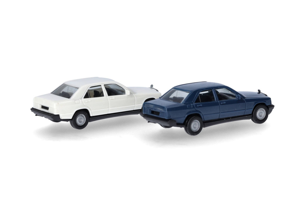 Stavebnice dvou osobních automobilů Mercedes-Benz 190E s karosérií v bílé a modré barvě.