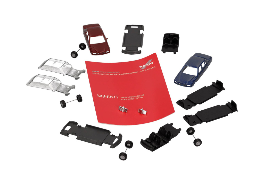 Stavebnice 2 kusů osobního automobilu automobilu Mercedes Benz třídy S W126, dostupný v safírově modré a vínové barvě. Díky zacvakávací konstrukci Herpa lze MiniKity sestavit v několika krocích bez lepidla (návod k montáži je součástí balení).