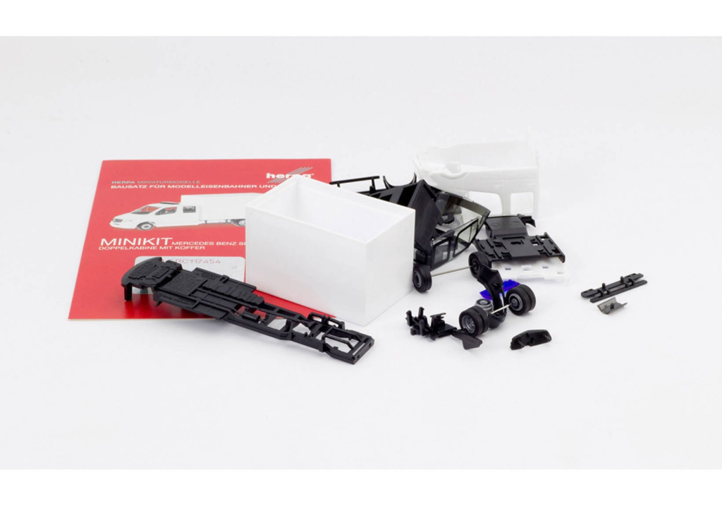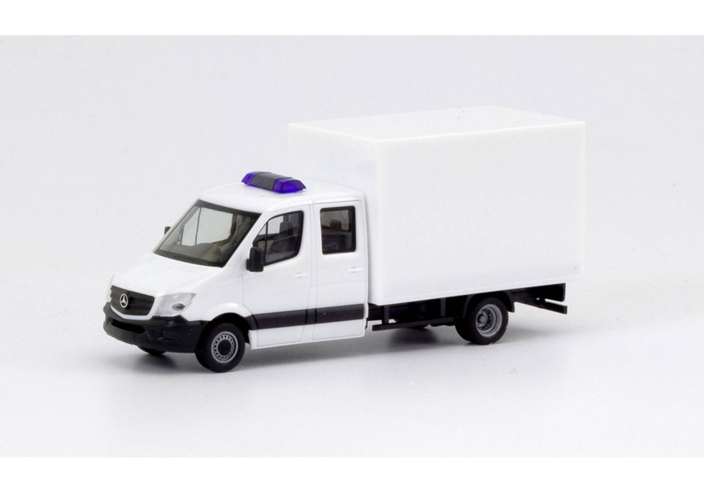 Stavebnice dvounápravové dodávky Mercedes-Benz Sprinter s dvojitou kabinou a skříňovou nástavbou.Kabina i skříň v bílé barvě,černý podvozek,bez potisků,modrý maják jako doplněk bez předvrtaných otvorů .