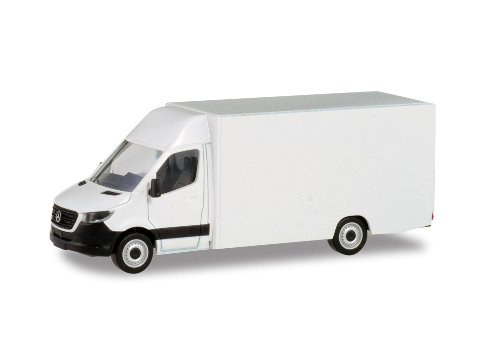 Stavebnice modelu dodávky Mercedes-Benz Sprinter `18 s uzavřenou skříňovou nástavbou používanou jako balíkové disribuční vozidlo.Model je v bílé barvě bez potisků.
