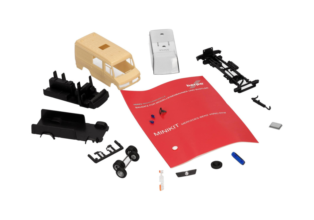Stavebnice uzavřené dodávky Mercedes-Benz Vario jako záchranné vozidlo v bílé barvě s možností doplnění třemi majáky v modré barvě/otvory nejsou předvrtány/.