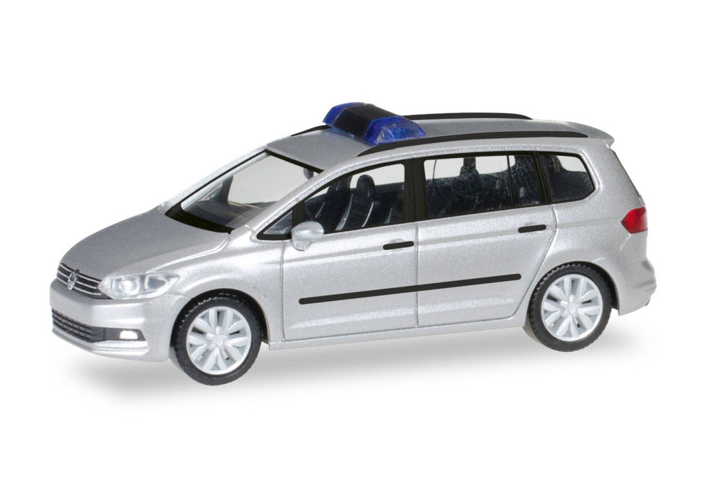 Stavebnice modelu VW Touran ve stříbrné barvě s modrým majákem.