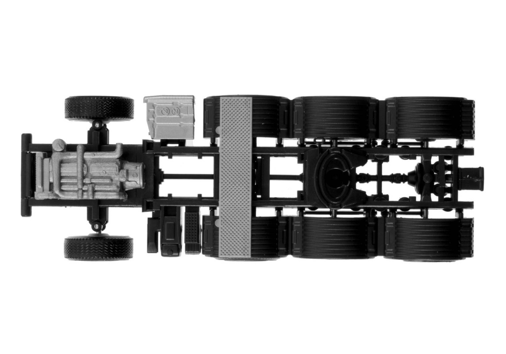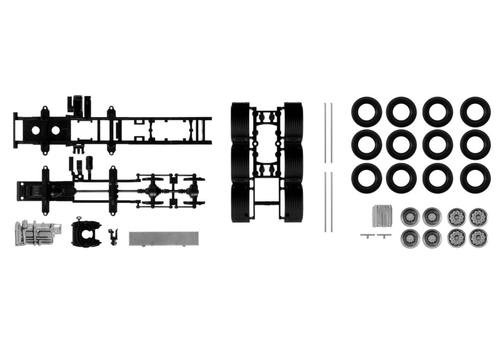 Stavebnice modelu podvozku pro čtyřnápravový těžký tahač Volvo. Podvozek je v černé barvě se stříbrnými doplňky.