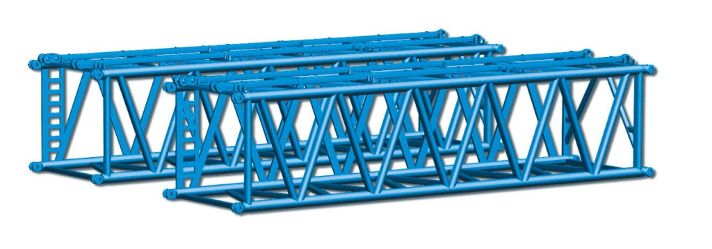Dva kusy velkých příhradových nosníků se spojovacím materiálem pro jeřáb Liebherr LR 1600/2 Felbermayr .Nosník má obdélníkový průřez cca 35x30mm v délce cca 140mm. Návod na sestavení je součástí balení.