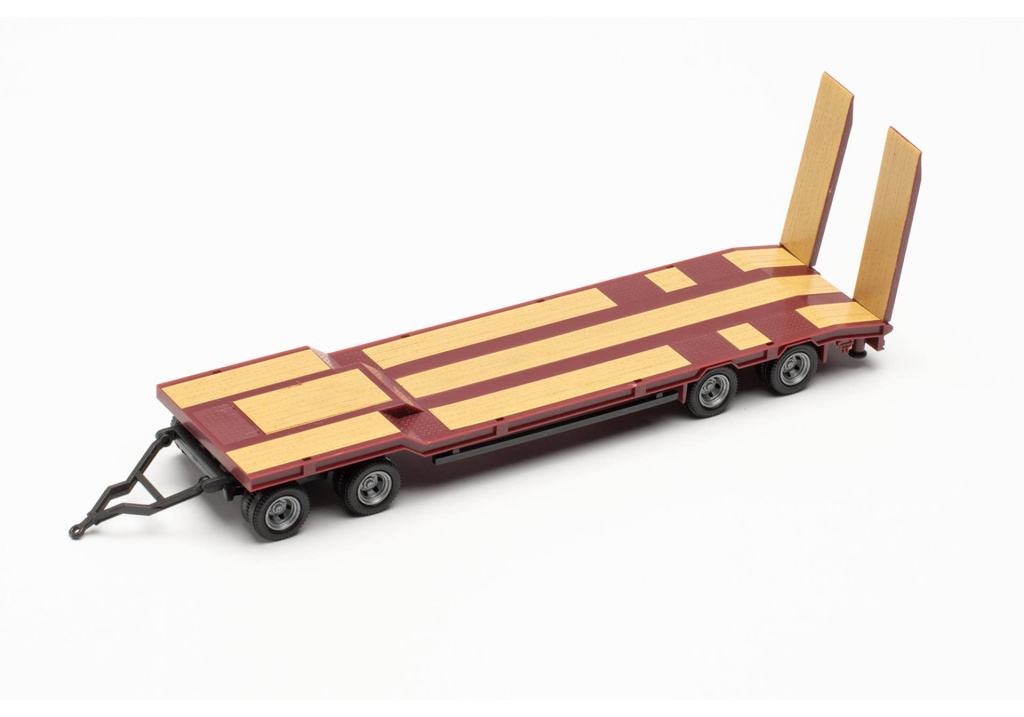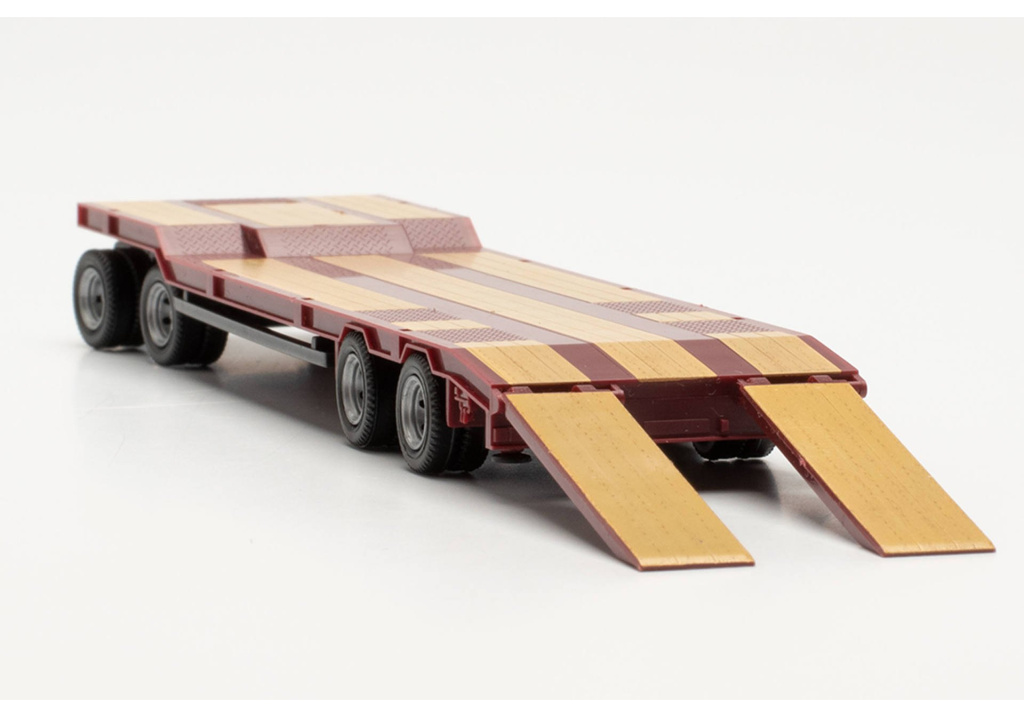 Čtyřnápravový plošinový přívěs TU4 s nájezdovými můstky určený především k přepravě stavebních strojů v tmavočerveném provedení.
