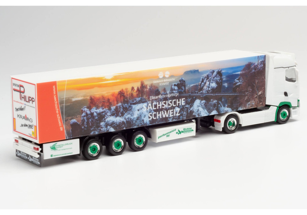 Model dvounápravového tahače Renault T s třínápravovým skříňovým návěsem přepravní společnosti Philipp z Radebeulu,kde na návěsu propaguje domovský region Saské Švýcarsko.