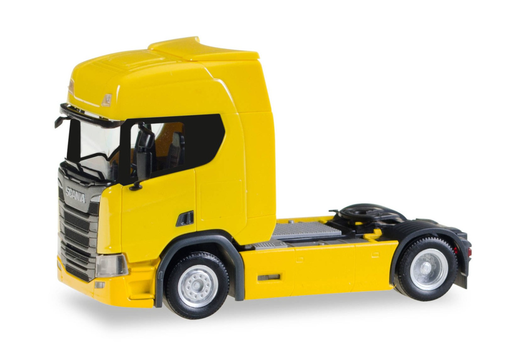 Model nového dvounápravového tahače Scania CR 20 HD s kabinou ve žluté barvě.