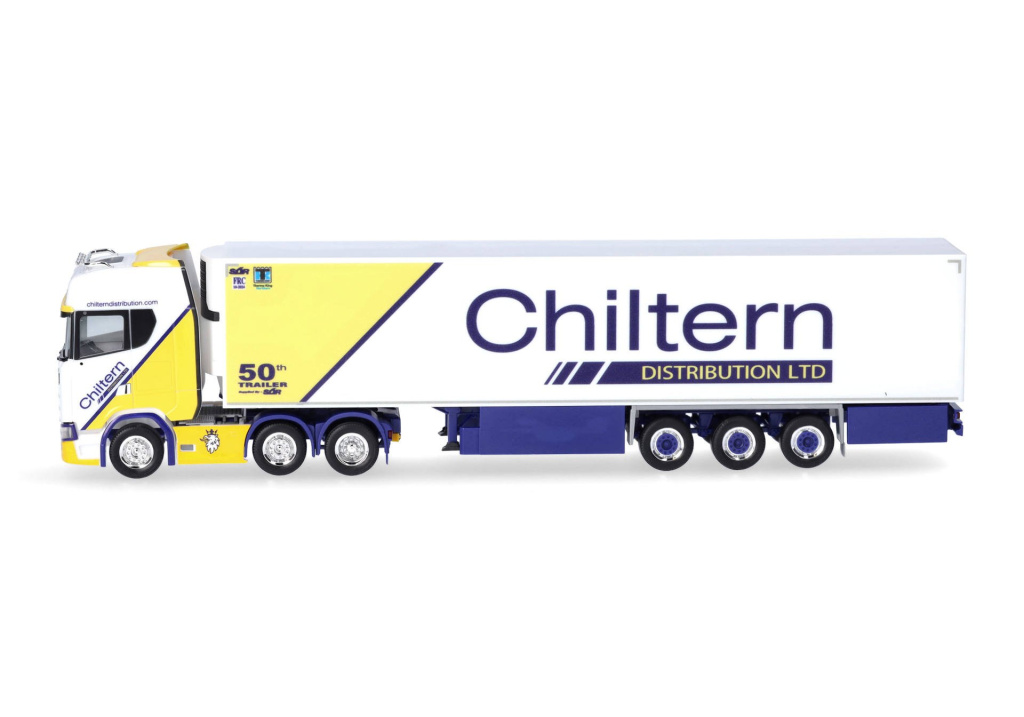 Model třínápravového tahače Scania CS 20 HD s pohonem 6x2 s třínápravovým chladírenským návěsem v barvách anglické dopravní společnosti Chiltern.