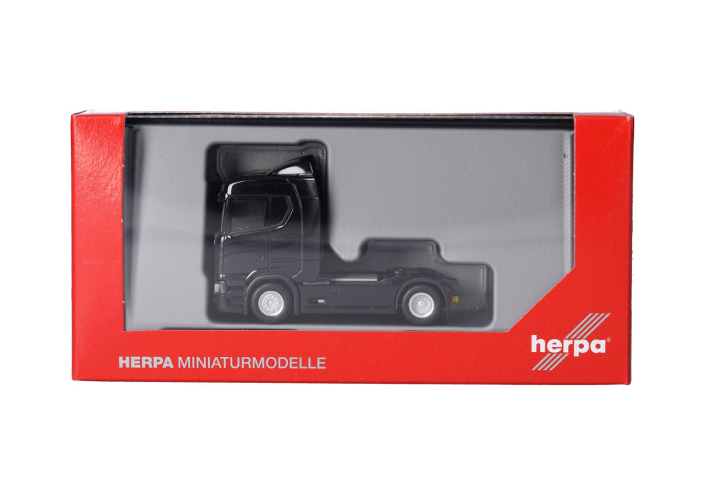 Model dvounápravového tahače Scania CS 20 ND s kabinou v černé barvě.
