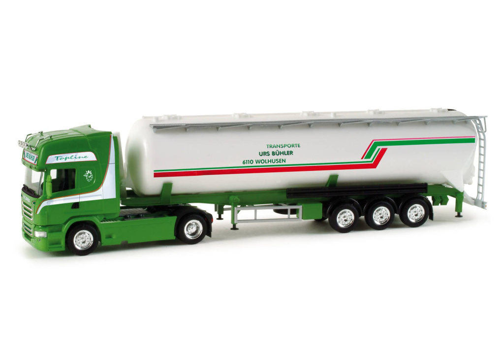 Model dvounápravového tahače Scania R 09 TL s třínápravovým silocisternovým návěsem švýcarské dopravní společnosti Urs Bühler.
