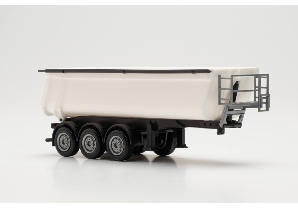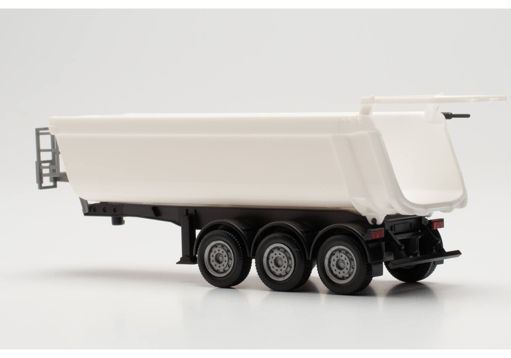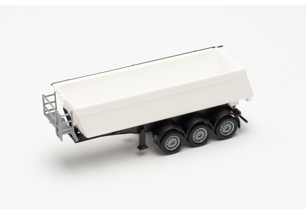Model třínápravového sklápěcího vanového návěsu Schmitz Cargobull s bílou korbou a černým rámem.