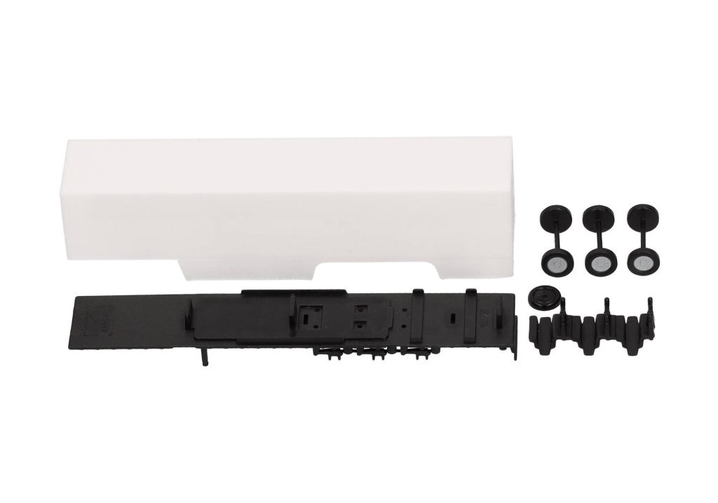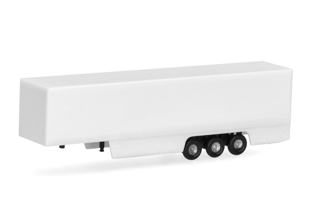 Stavebnice třínápravového skříňového návěsu v bílé barvě s černým podvozkem.