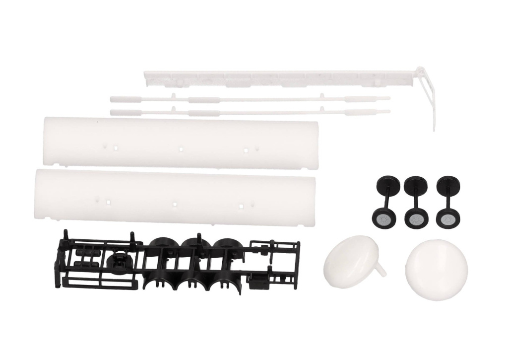 Stavebnice třínápravového cisternového návěsu v bílé barvě s černým podvozkem.