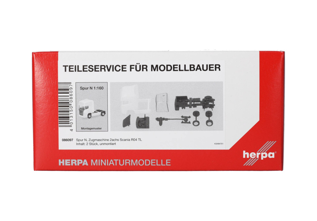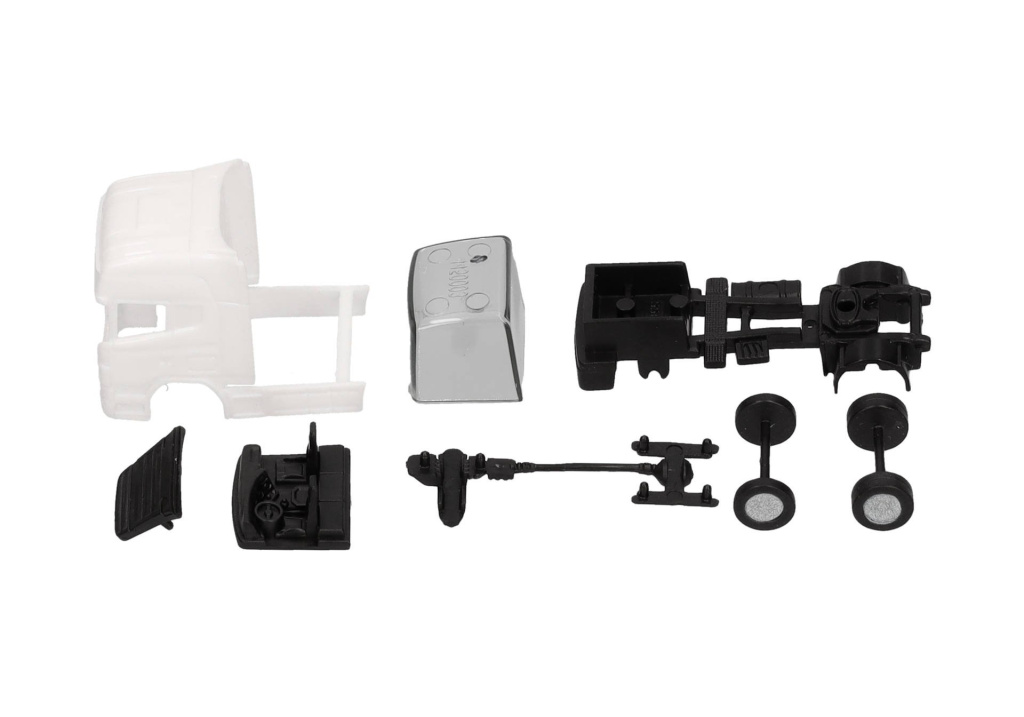 Stavebnice dvounápravového tahače Scania R TL v bílé barvě s černým podvozkem.