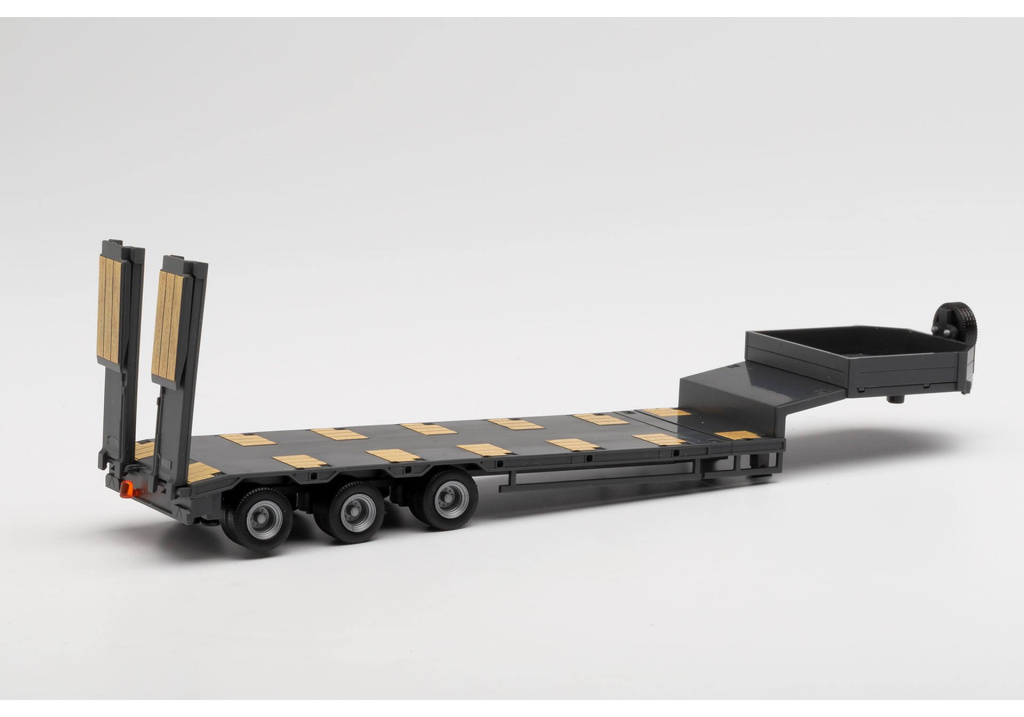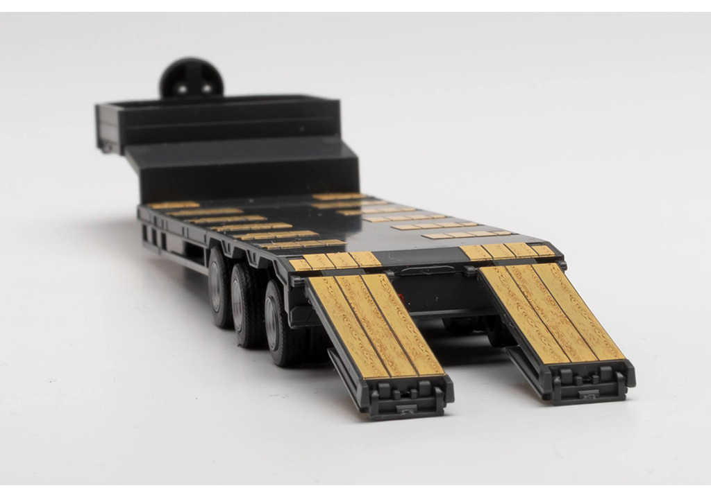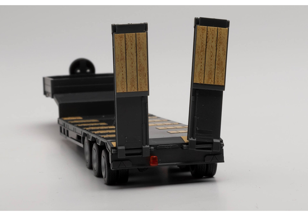 Model těžkého třínápravového návěsu Goldfhofer se zadními sklápěcími nájezdy v černé barvě.