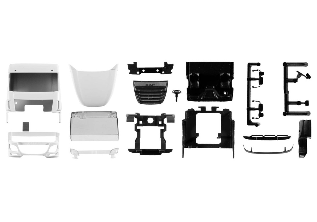 Stavebnice kabiny pro DAF XF SC Euro 6 se spojlerem a ušima v bílé barvě.