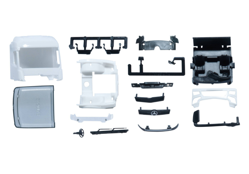 Stavebnice kabiny Mercedes Benz Actros 2011 v provedení Streamspace/nízká/ se střešním spojlerem,s bočními kryty za kabinou/uši/,se sluneční clonou a krytem na šasí. Kabina,spodní díl kabiny,nárazník a kryt na šasí je v bílé barvě,dvoudílná samostatná maska a ostatnídoplňky jsou černé.