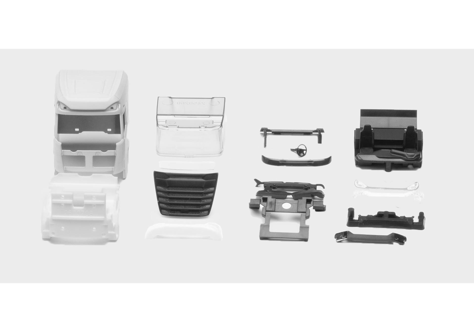 Stavebnice modelu kabiny pro DAF XG+, v bílé barvě,s vysokou střechou,bez spojleru,bez bočních krytů a bez sluneční clony.